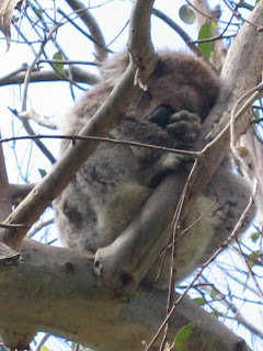 Chris kept calling Alison and I, the California girls who live in New Zealand. He knew we were interested in seeing kangaroos, so he stopped at one point where we could see them in the distance. Then we stopped at another place where they were quite close. It was so exciting. I saw at least 8. We passed by a beach with rocks. A big shipwreck occurred there. At times, part of the wreck would wash up on shore, but they are still not sure where it is. We continued on to a place where you could see koalas. We saw a couple different Australian parrots. One was colourful and the other was white with a yellow feather sticking out of its head. There were two kookaburra birds. A guy was feeding them a lot of steak. We walked down a path and saw a couple koala bears. They were asleep and looked adorable! We went a little further and saw another one that was bigger. It started moving and we realised it was a mother and a baby. The baby was waking up and looked at us a couple times. We walked back and eventually headed for the rainforest. During this drive, we noticed a couple spiders crawling on the ceiling and other places in the car. The seat covers were furry and kind of scary. We weren't sure of what kind of critters lurked under there.